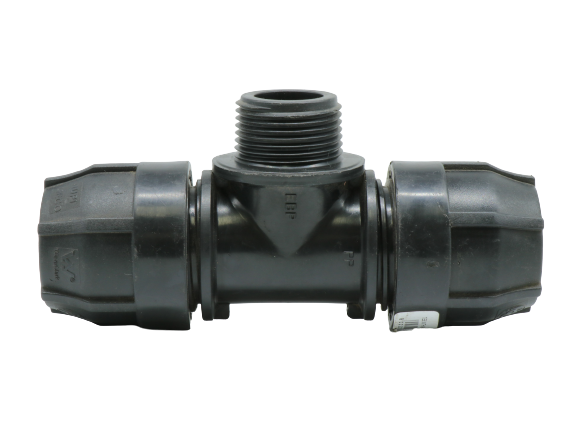 HD compression fitting - tee - 25mm poly x 25mm poly x 1" male thread. For use with 25mm high density poly pipe.